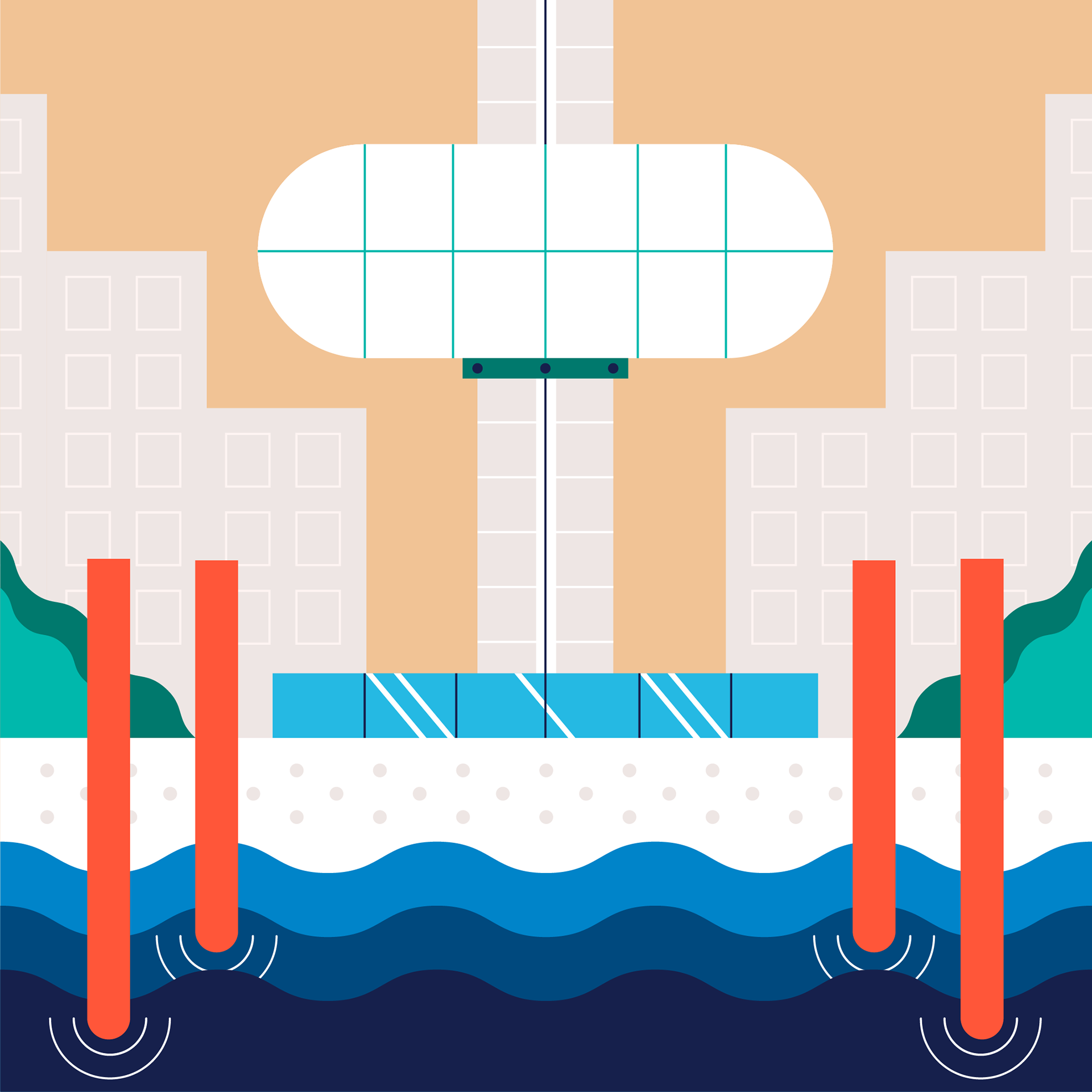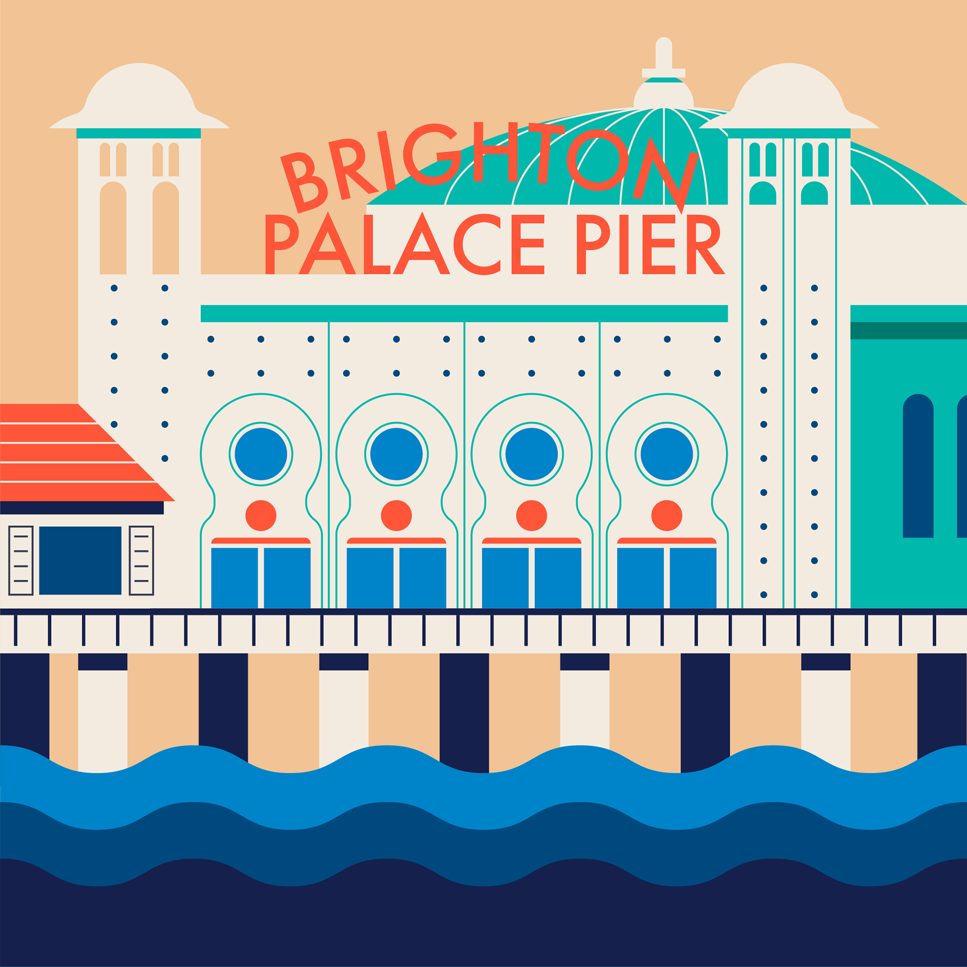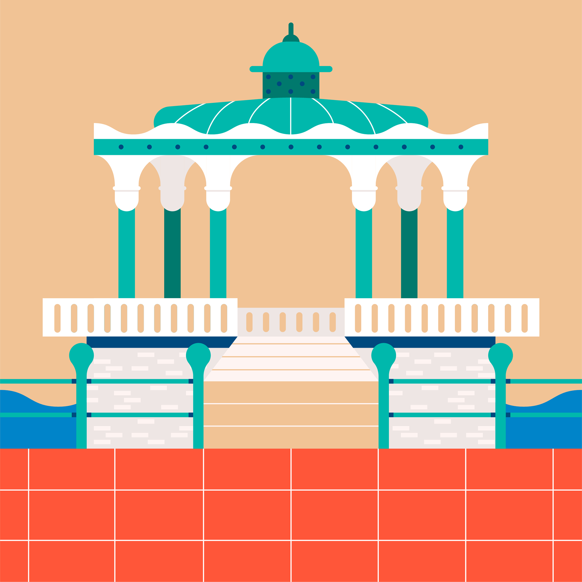 A series of illustrated icons showing local tourist destinations in Brighton, UK. Brighton Pier, Brighton Bandstand and the i360.