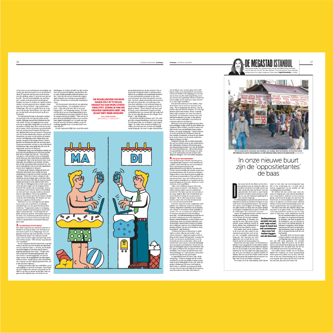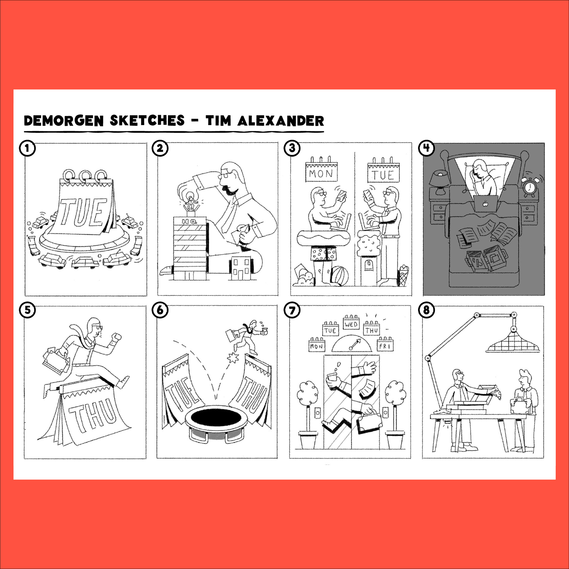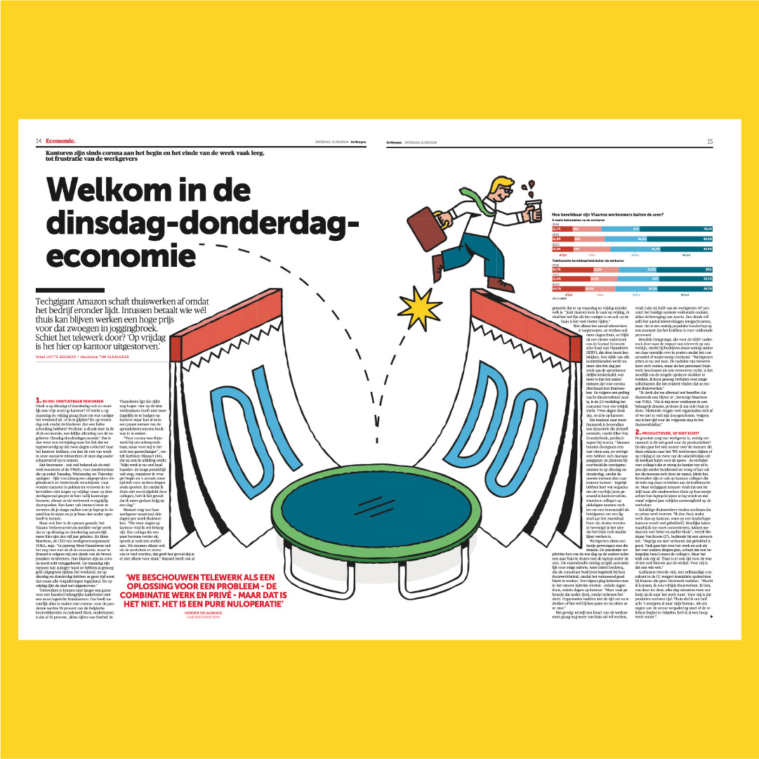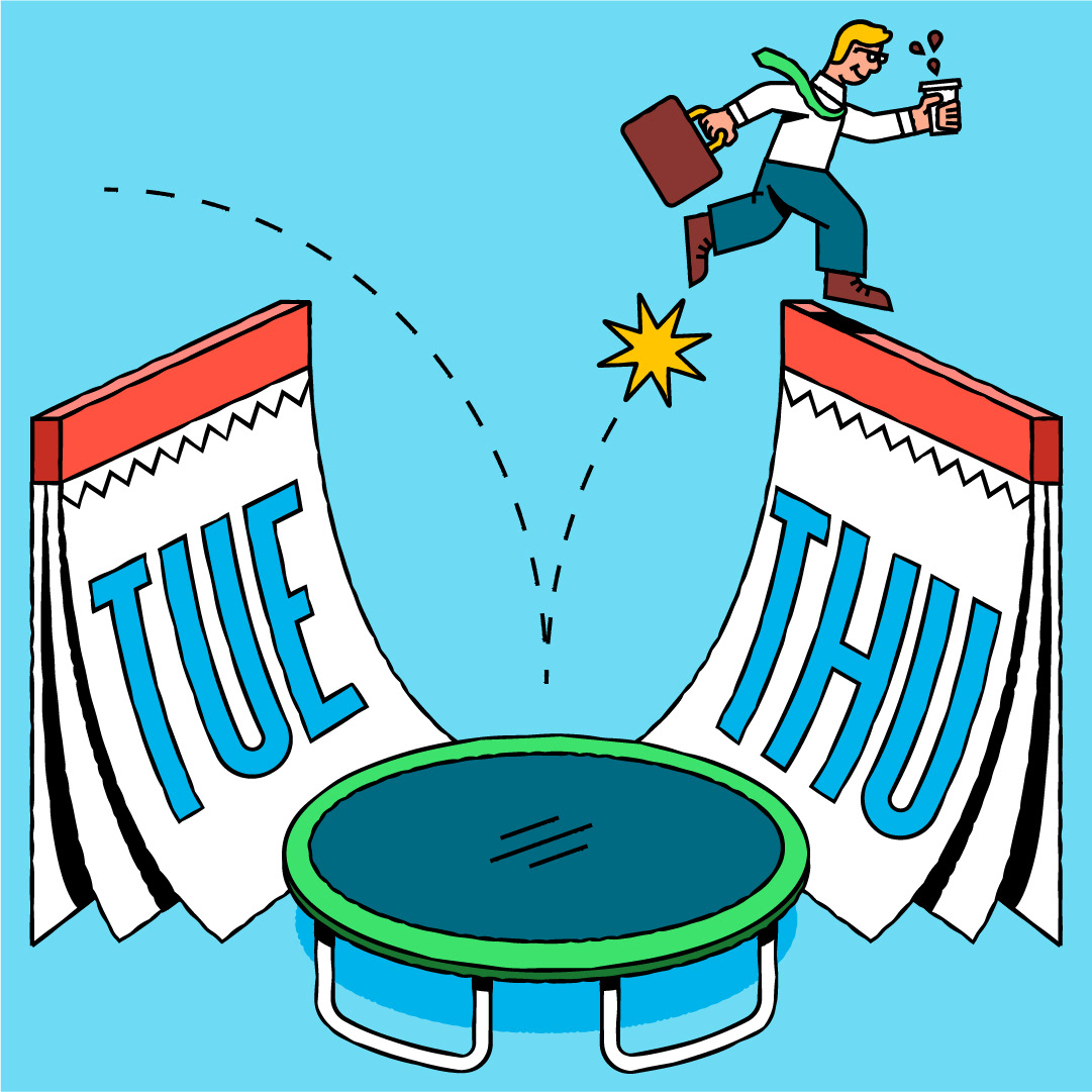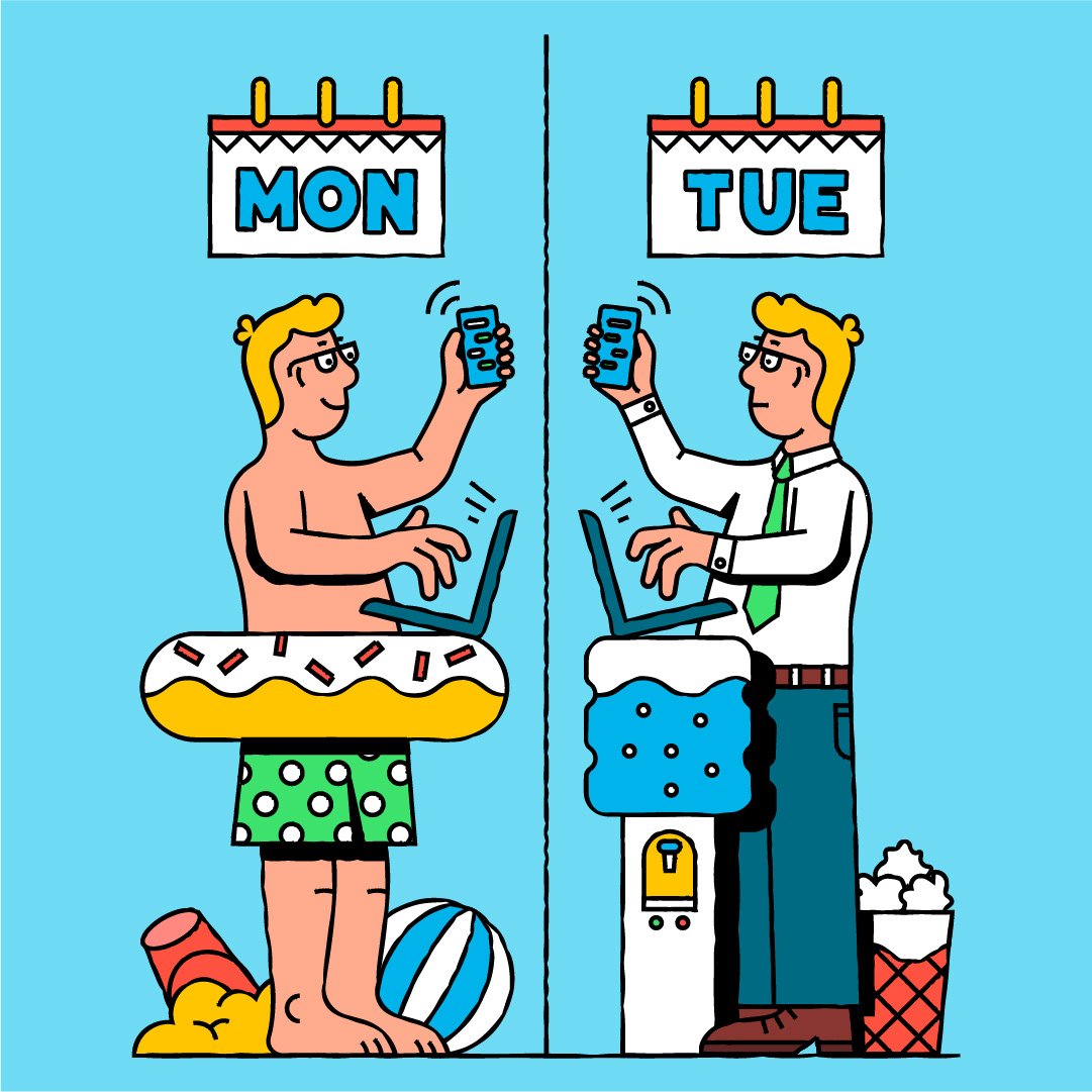 Editorial illustrations for an article about the trend of hybrid working in offices and how employees are splitting up their work week.