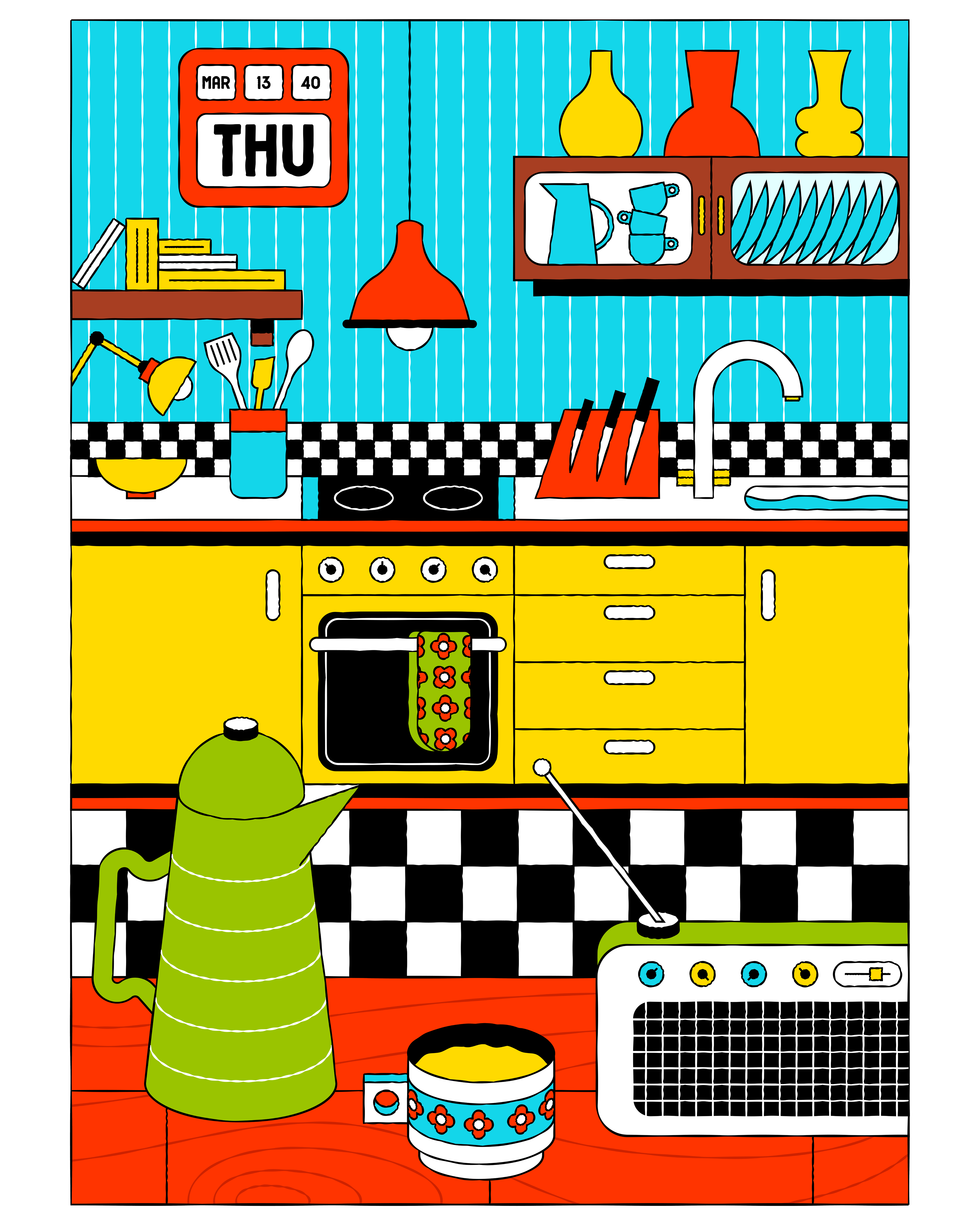 I recently illustrated this interior kitchen scene focusing on mid century design and the objects from that era. I'd love to own a kitchen this colourful!