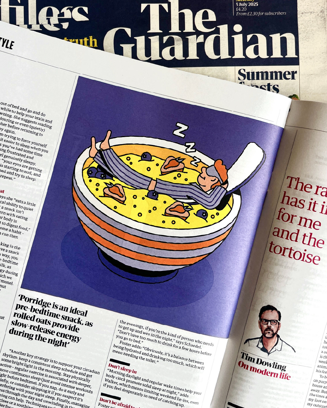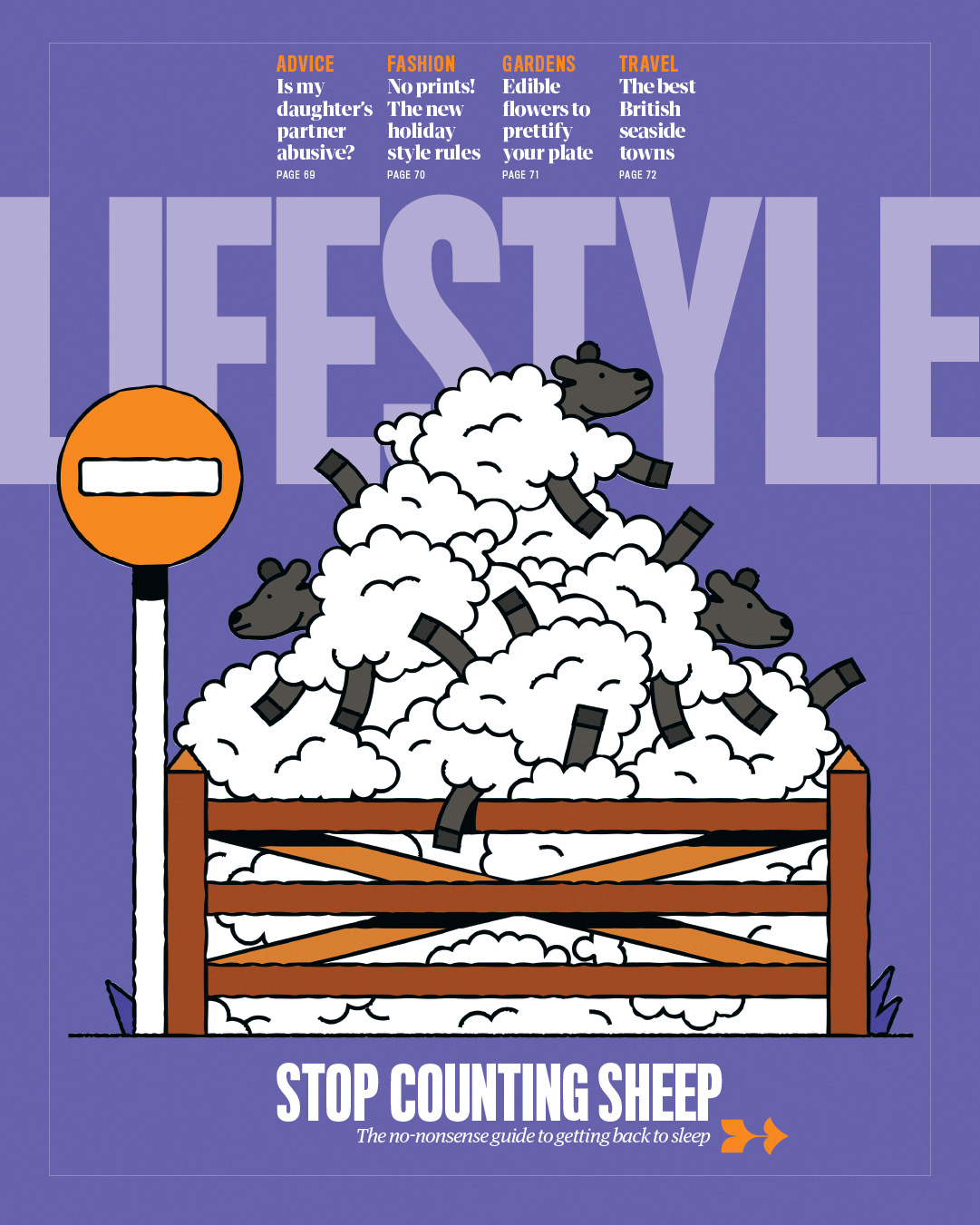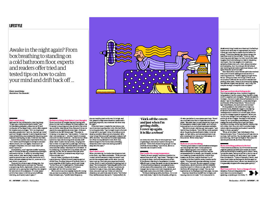 Cover illustration for The Guardian's Saturday supplement. The feature was called 'How to get back to sleep' and it's about when you wake up in the night and struggle to get back to sleep.
