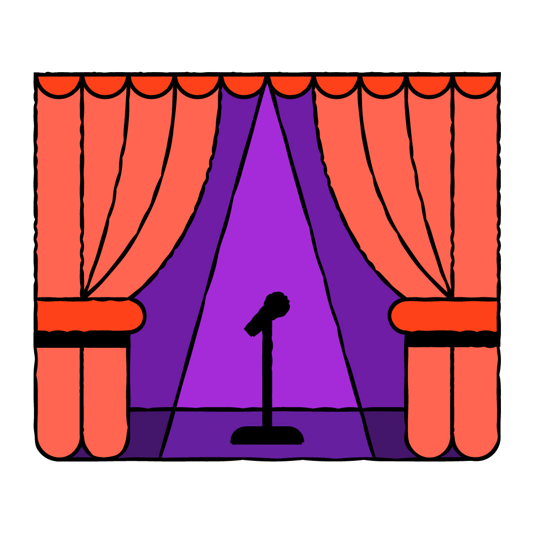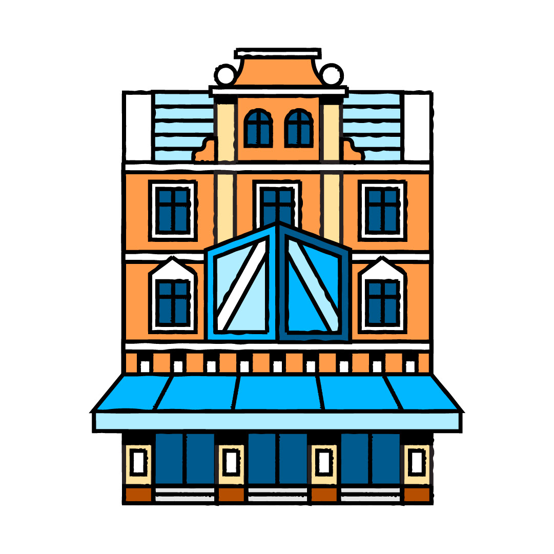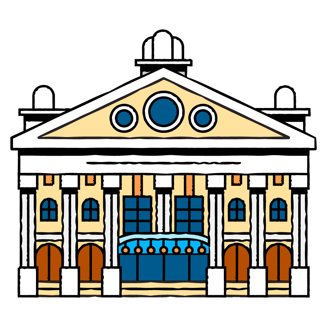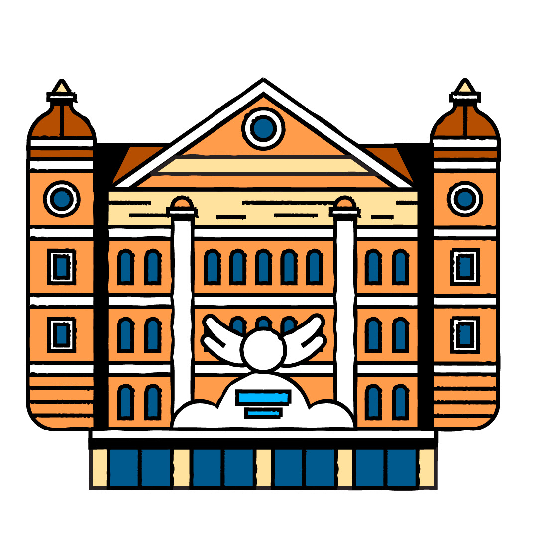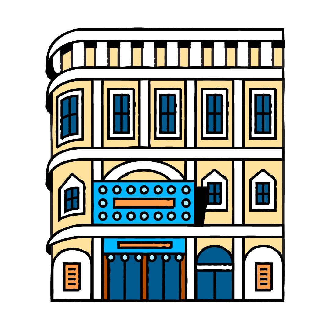 . Spot illustrations show the differerent venues, stage shows and theatre icons.