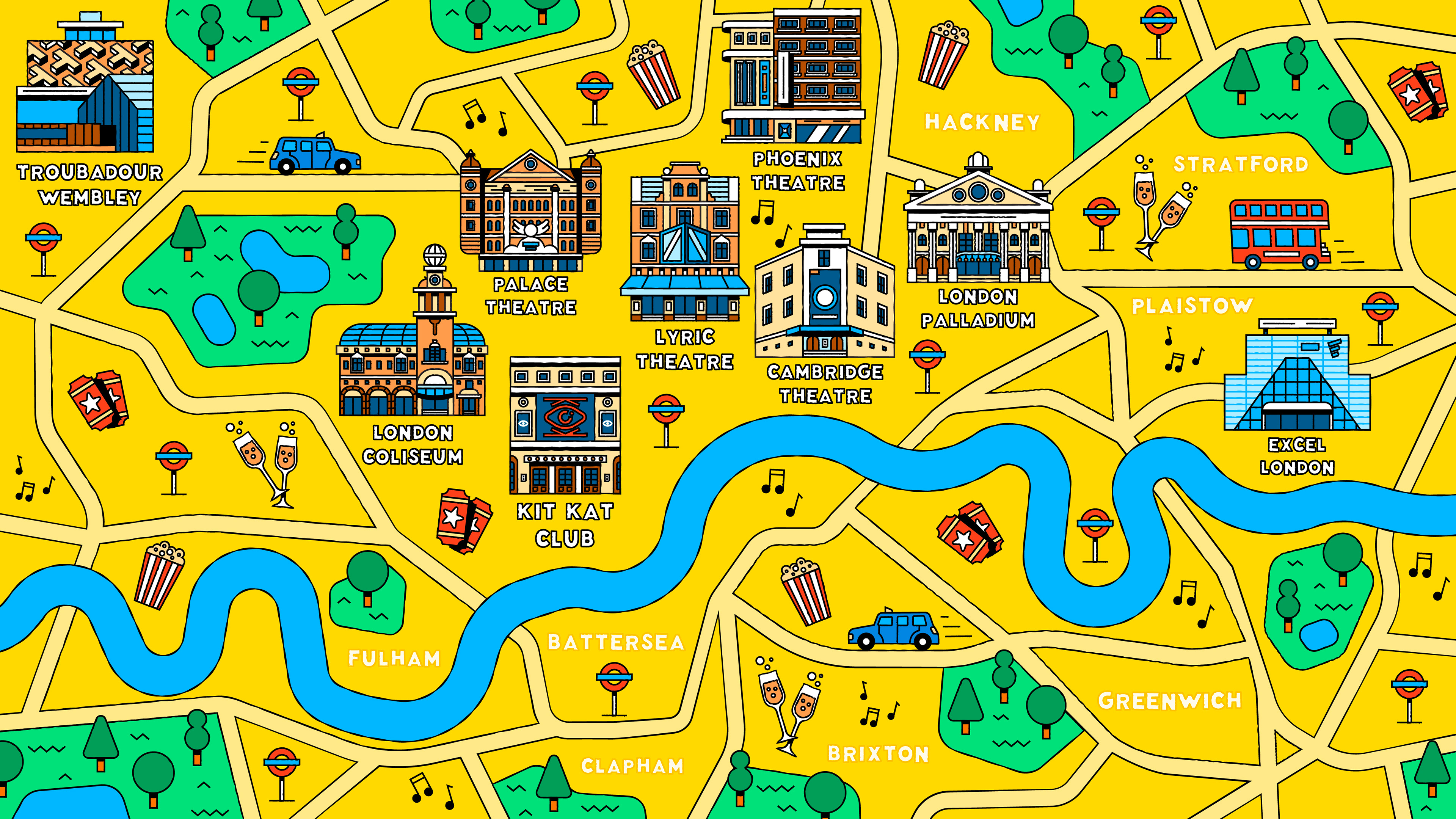 Illustrated culture map commissioned for Time Out, celebrating the best stage shows on in London this summer. Interactive map available on the Time Out website